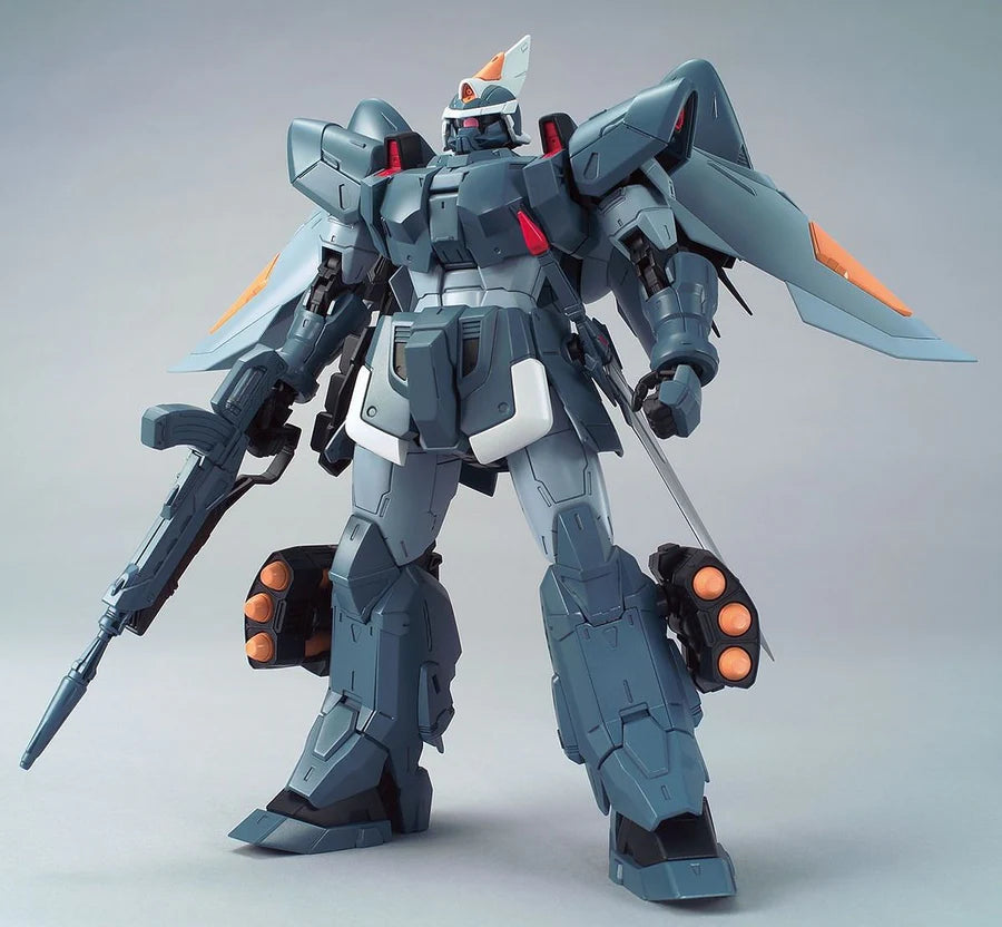 It features the MG series' internal frame configuration, and the mechanical design of its characteristic backpack is impossible to miss. The backpack moves up and down, and also swings backward for a wide range of movement; the heavy sword is newly designed, and the handle of the triple short-range guided missile launcher pod can be pulled out. Four magazines and one magazine rack are also included; one magazine can be attached to the rifle, and the remaining three can be attached to the rack.