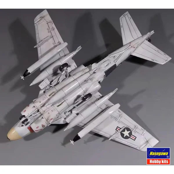 The Hasegawa 1/72 A-6E Intruder kit reproduces the look of the US Navy attack jet in a small, display-friendly scale. Recognised for its all-weather attack role, the Intruder is modelled here with attention to the aircrafts distinctive silhouette and mission equipment placement.